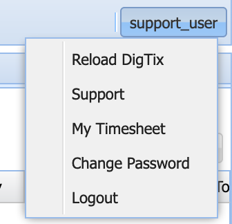 1. Click on the account menu in the top right corner of the DigTix user interface. Within the account menu, click on the "Support" option. Only managers and administrators have the "Support" option in the account menu.