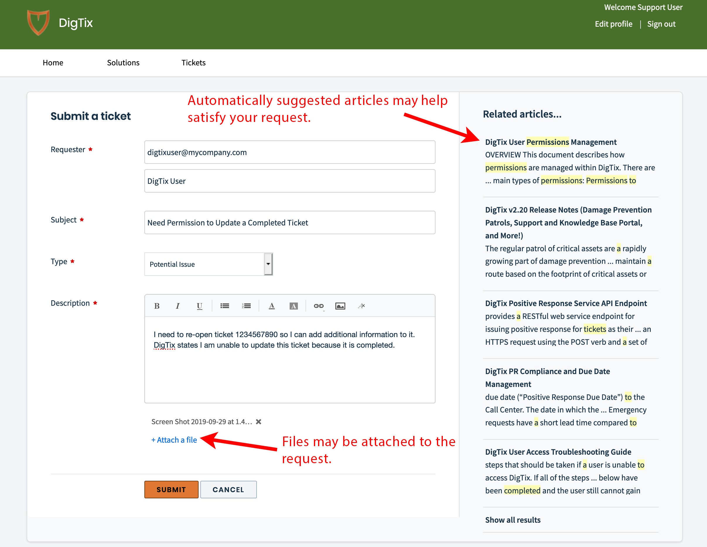 3. Fill out the appropriate information about your support request. As you type your request, knowledge base articles will be recommended on the right side of the page. These articles may be helpful in satisfying your request. Files may be included by attaching them to your request. Attaching screenshots of DigTix is especially helpful to the DigTix Support team when servicing your request.