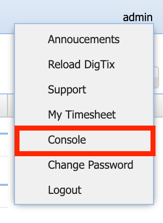 4. After you have performed the relevant actions, click on the account menu in the top right corner, and then click on "Console". This will open the DigTix debug console.