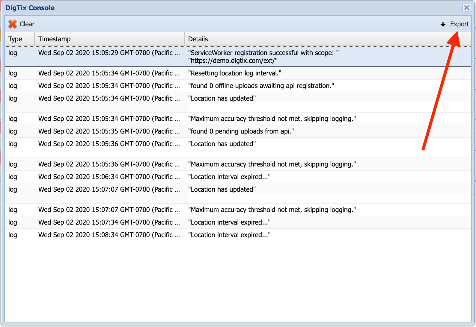 5. On the DigTix console window that appears, click on the "Export" button towards the top right corner of the window. This will download a diagnostic text file to your device.