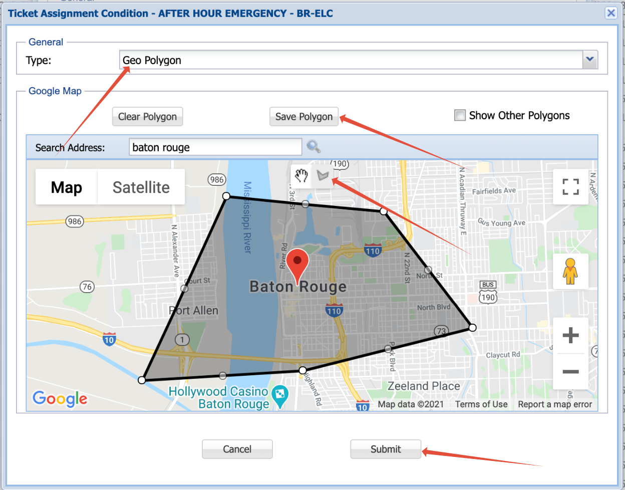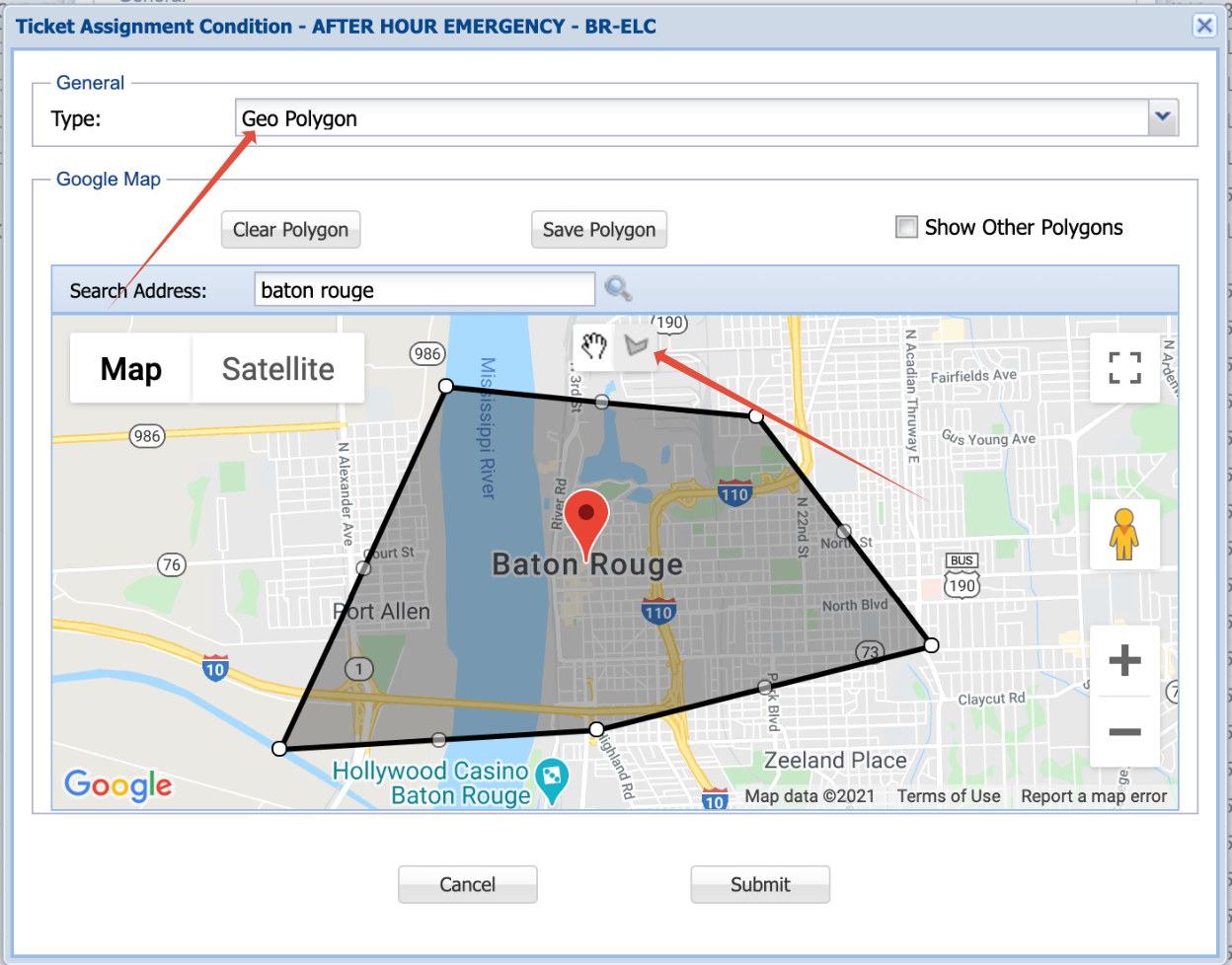 Figure 3: Polygon Drawing tool 6. Once your polygon is created, click "Save Polygon" and then "Submit". This will save your polygon and add it to the rule's conditions.
