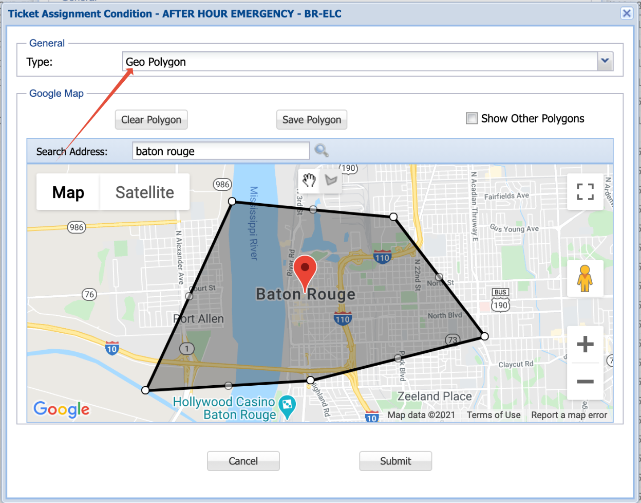 Figure 1: Ticket Assignment Rule where Conditions are created 4. Under the "Type" field, select "Geo Polygon". This will bring up Google Maps below.