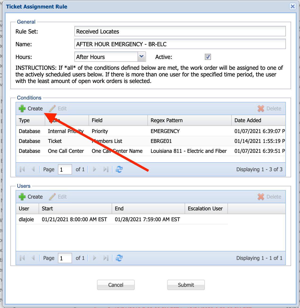 3. Click on the "Create" button at the top of the "Conditions" section to create a new rule condition.