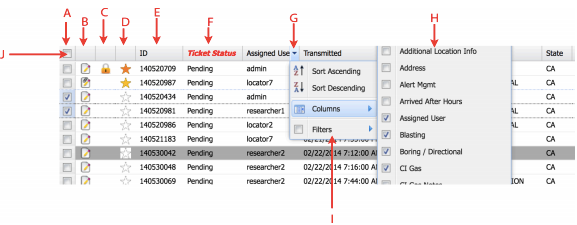 J. Select All Tickets Button. Click the ticket selection column header to select/deselect all of the tickets in the current grid page.