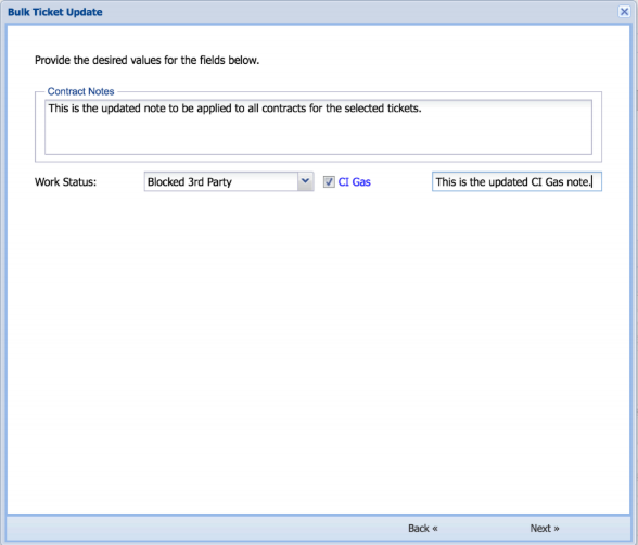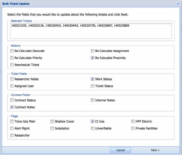 Once the Bulk Update icon is selected, a Bulk Ticket Update pop up window will appear, as seen in Figure 5. There are many fields that the user can choose on Page 1 to perform a bulk update. Some are related to the ticket itself while others relate to the contract(s) that belong to the selected tickets. Finally, there are actions such as Rescheduling or Re-calculating Geocodes, Priorities, Assignment, and Proximity that can be performed on the selected tickets.