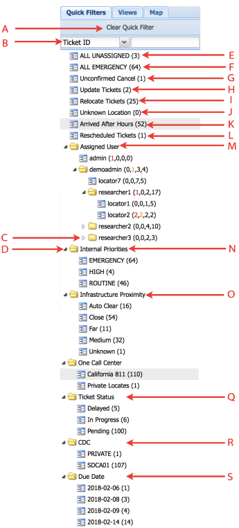 M. Assigned User Quick Filters. Filter tickets that are assigned to a particular user. The users are organized in a tree hierarchy based on their manager. The three parenthesized numbers indicate the number of open overdue, due today, due tomorrow, and future-due tickets (respectively) assigned to each user. On non-touch (i.e. non-mobile) devices, users can re-assign tickets by dragging and dropping rows from the Ticket Grid onto usernames within this section.