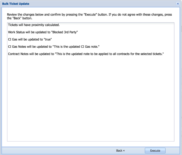 Page 3 is where you do a final review of the updates being made before applying the changes. It is important to carefully review all changes being requested to ensure accuracy and avoid errors. If an issue is spotted, click the “Back” button to revise the fields and/or values. Otherwise, click “Execute” to perform the bulk update and move on to Page 4.