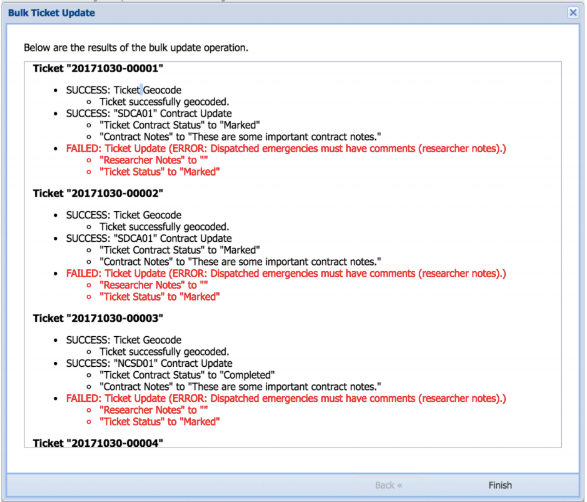 Once the bulk update has been completed, Page 4 will display the results of the operations. It is important to confirm that all operations were successful. Certain operations may fail due to data validation or permission restrictions. Failed operations will be shown with a red “FAILED” message along with the reason for failure. After review of the bulk update results, click the “Finish” button to close the bulk update window. The tickets that were selected for the bulk update operation will be automatically deselected.