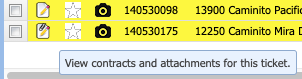 Attachments can be seen in the Ticket Grid with the icons that look like a piece of paper. If the paper has a paper clip attached to it, then that ticket includes an attachment. Examples are below in Figure 11. Clicking on the ticket attachment will automatically pull up the Service Tab of the Ticket Window.
