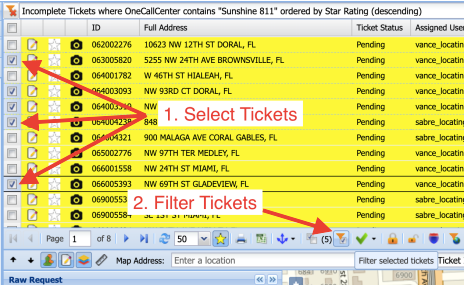 Users may now filter specific locate requests by selecting which tickets they would like to filter and then click the "Filter selected tickets" button, which looks like a checkmark accompanied by a funnel. This is especially useful for identifying and focusing on the jobs you'd like to complete next. Filtered tickets appear by themselves in both the grid and map for easy route planning.