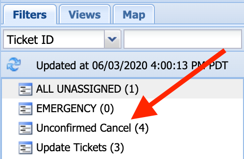 Once a locate request is received by DigTix, it is automatically processed into the system. During this process, DigTix evaluates the contents of the locate request and looks for evidence that the locate request may have been cancelled. If evidence is found, DigTix flags the ticket as an "Unconfirmed Cancellation". Such tickets are easily identifiable within the DigTix application as describe below.