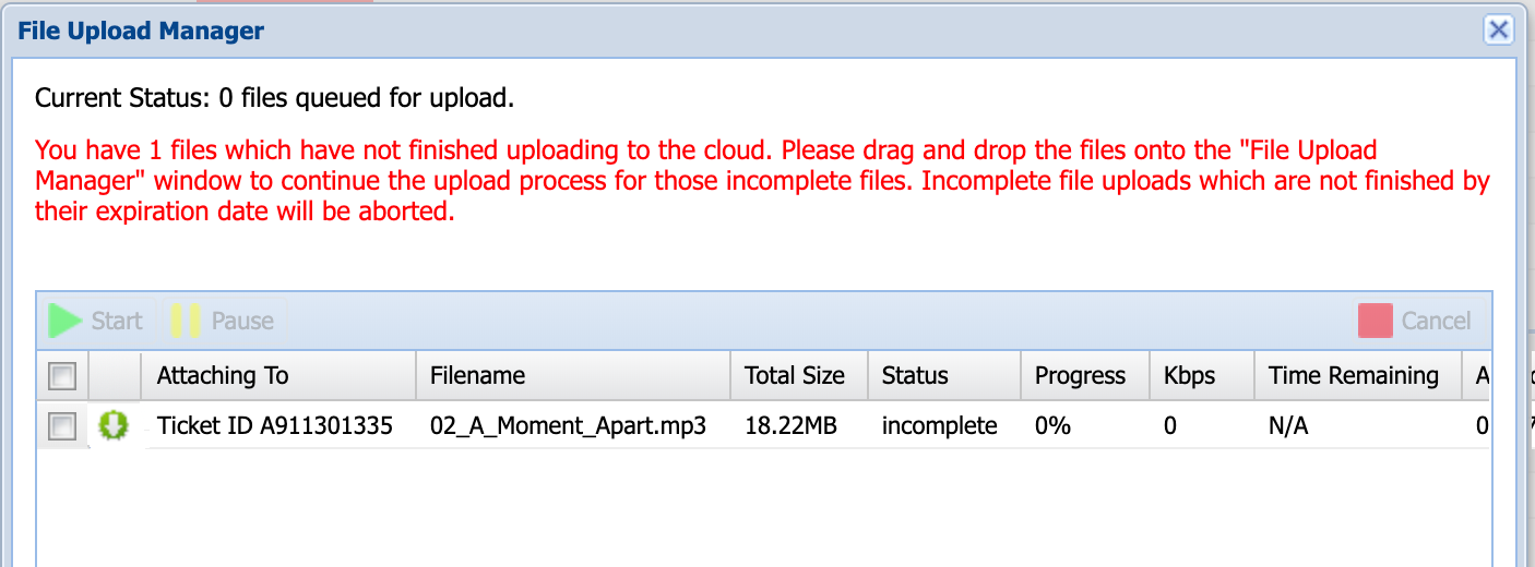 incomplete: The file upload was interrupted due to the closing of the DigTix application before the file upload could be completed. The file upload can be resumed by dragging and dropping the file on the File Upload Manager window.