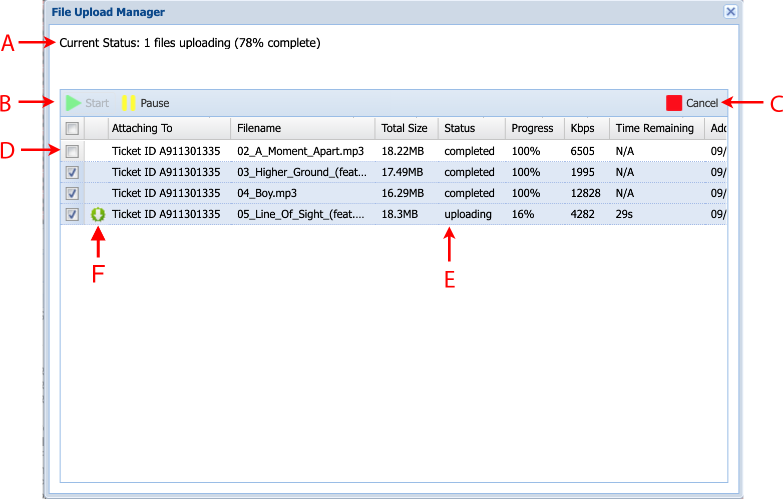 B. Start and Pause Buttons. These buttons will start or pause the selected file upload(s), respectively.