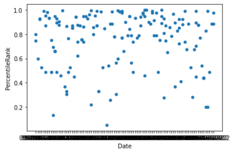 Each blue dot represents an incident that occurred. The x-axis is time while the y-axis is the relative DigSights incident prediction score. The clustering of blue dots (i.e. incidents) at the top of the chart visualizes DigSights capability to effectively predict incidents before they occur.