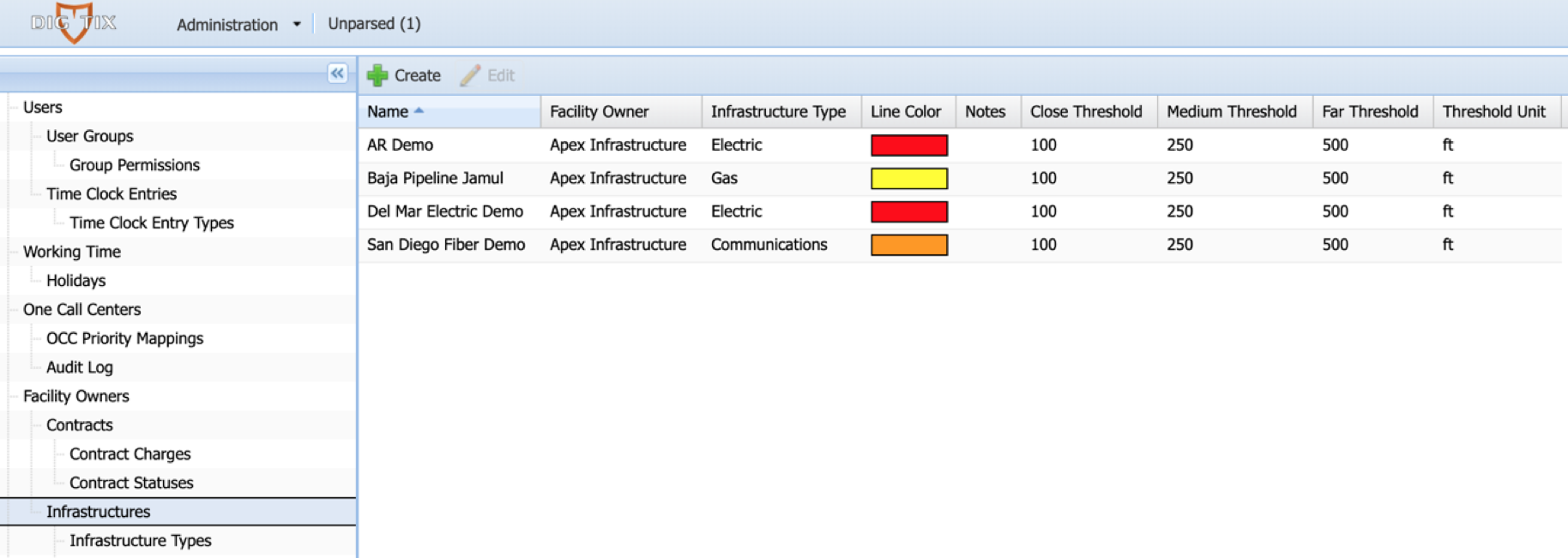 DigTix infrastructure layers can be accessed via the Infrastructures section of the Administration page. Each layer is listed as a separate row with information including name, style, and proximity thresholds.