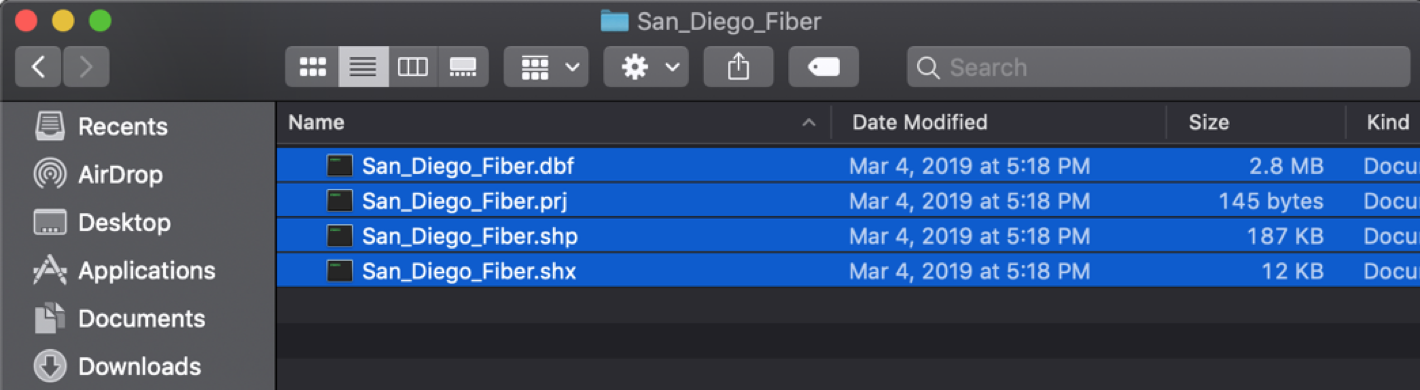 - Select (highlight) the files. The four file types are required to create a valid ESRI Shapefile layer: .shp, .shx, .dbf, .prj