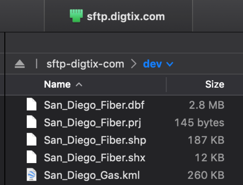 The screenshot below is from an intake folder on sftp.digtix.com server. In this example, the four ESRI Shapefiles (.shp, .shx, .dbf, .prj) would be procssed to update the Infrastructure layer named “San_Diego_Fiber” while the San_Diego_Gas.kml file would be processed to update the infrastructure layer named “San_Diego_Gas”.
