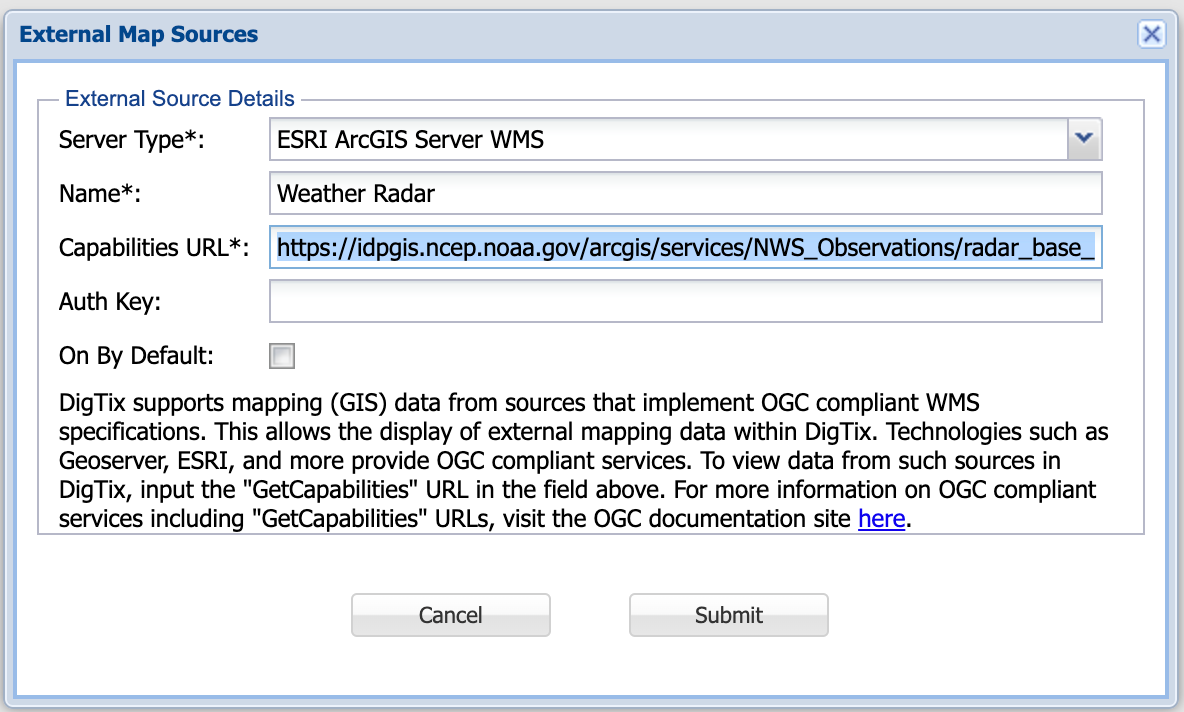 In the screenshot above, a data source is being configured to display weather radar data from the National Oceanic and Atmospheric Administration's (NOAA's) public mapping service. The GetCapabilities URL for this mapping service is https://idpgis.ncep.noaa.gov/arcgis/services/NWS_Observations/radar_base_reflectivity/MapServer/WMSServer?request=GetCapabilities&service=WMS. By configuring the GetCapabilities URL as shown above, with a preferred projection of EPSG:4326 or EPSG:3857, DigTix can analyze and display the data offered by that service within the DigTix application's maps.