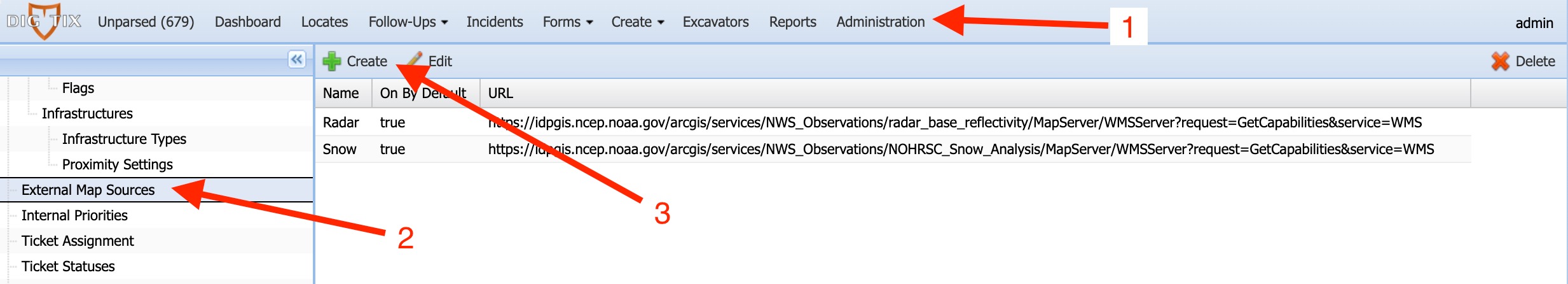 DigTix supports mapping (GIS) data from sources that implement OGC compliant WMS specifications. This allows the display of external mapping data within DigTix. Technologies such as Geoserver, ESRI, and more provide OGC compliant services. To view data from such sources in DigTix, the sources must be configured within DigTix via the "External Map Sources" section of the Administration page: