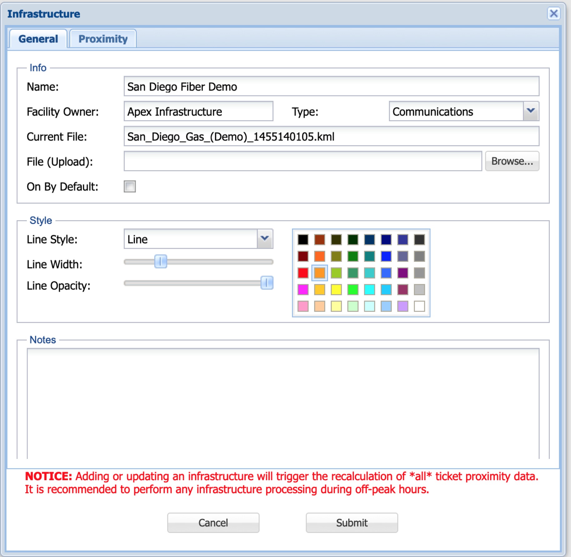 - Facility Owner: The facility owner that the infrastructure belongs to, as defined in the “Facility Owners” section of the Administration page. Note this field may not be updated after it is set.