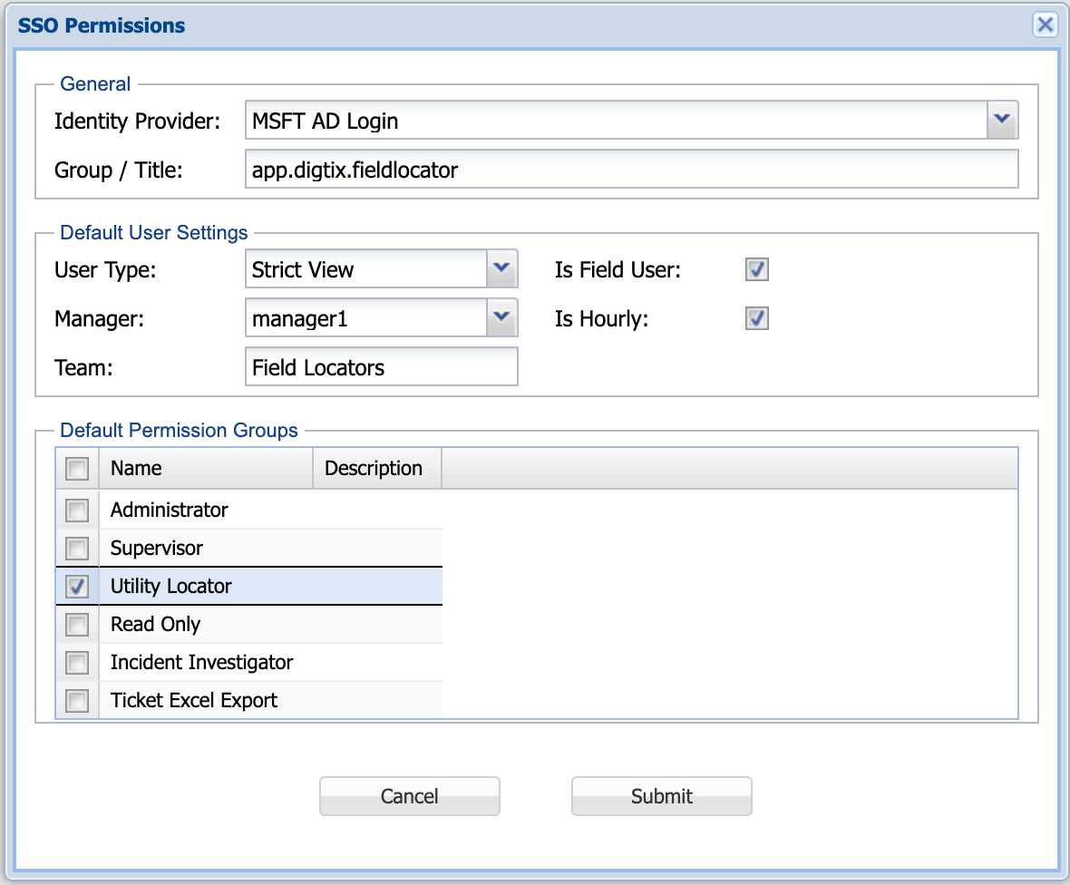 - A piece of information which will be used to determine the default permissions / access the user has within DigTix, such as a title ("Field Supervisor 2") or group name ("app.digtix.fieldsupervisor"). This will be referred to as the "SSO Permission Key" going forward.