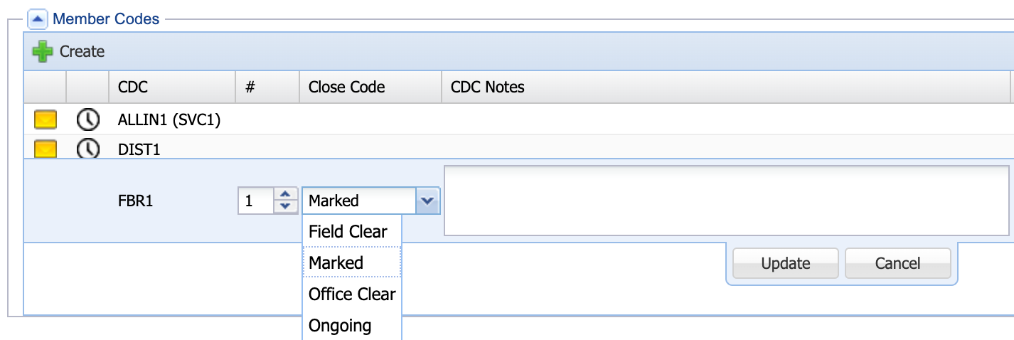 It is important to note that a ticket may involve multiple CDCs. In the figure above, there are three CDCs: FBR1, DIST1, and ALLIN1. The ticket may not be considered complete until all three CDCs have Close Codes applied which "Denotes Completion". For example if two CDCs have a "Marked" Close Code applied but the third CDC has an "Ongoing" Close Code applied, the ticket itself may not be completed until the "Ongoing" Close Code is updated to another Close Code which denotes completion.