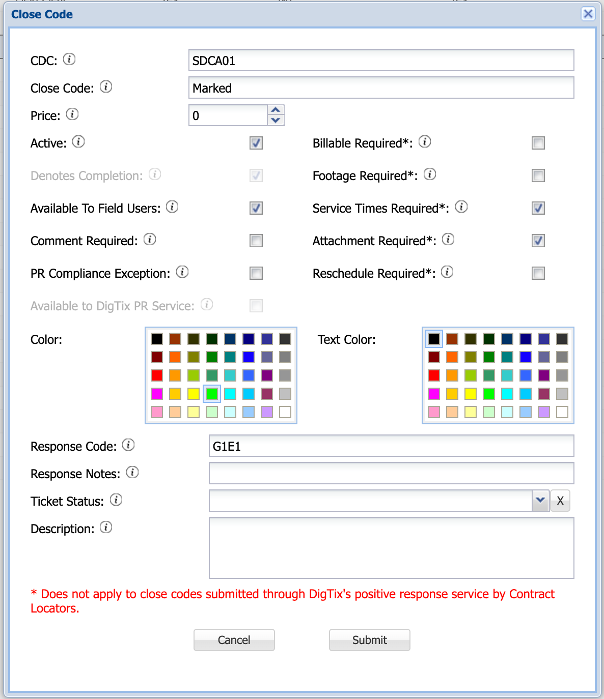 Comment Required: Whether the close code requires a note to be submitted within the "CDC Notes" input field of the locate request. If checked, a comment must be specified before the close code may be applied. If not checked, the close code may be applied without a comment.