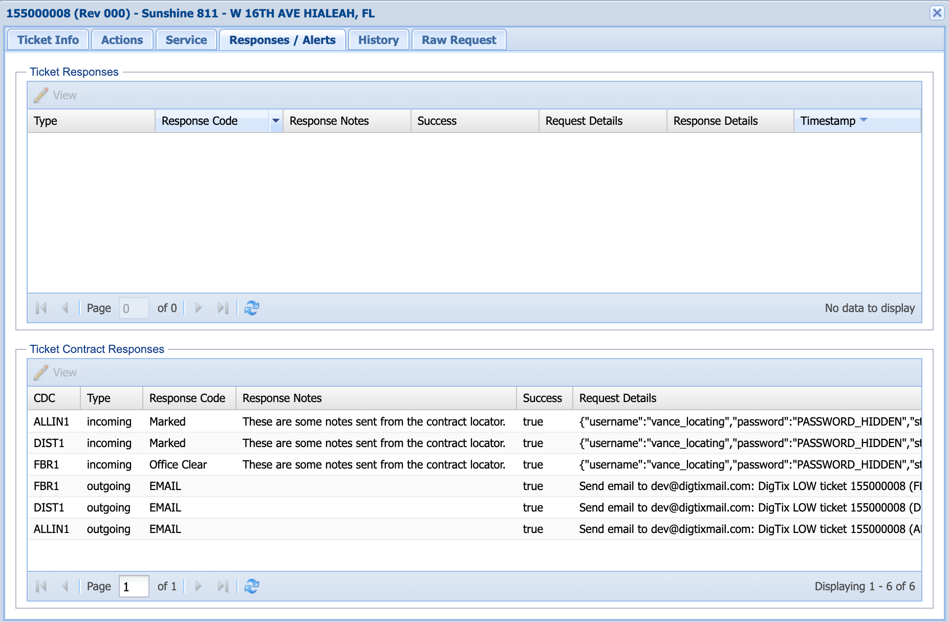 Response codes which are sent to third parties are logged within the "Responses / Alerts" tab of the ticket window.