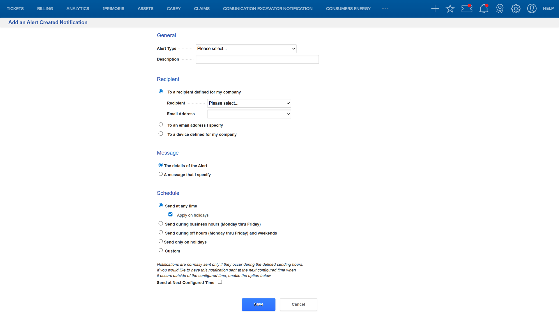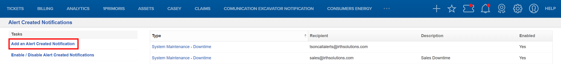 2. On the Alert Created Notification screen, click Add an Alert Created Notification.