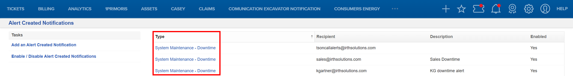 NOTE: To Modify a Notification, click the notification name in the Type column on the Alert Created Notifications screen, make the necessary edit, and click Save.