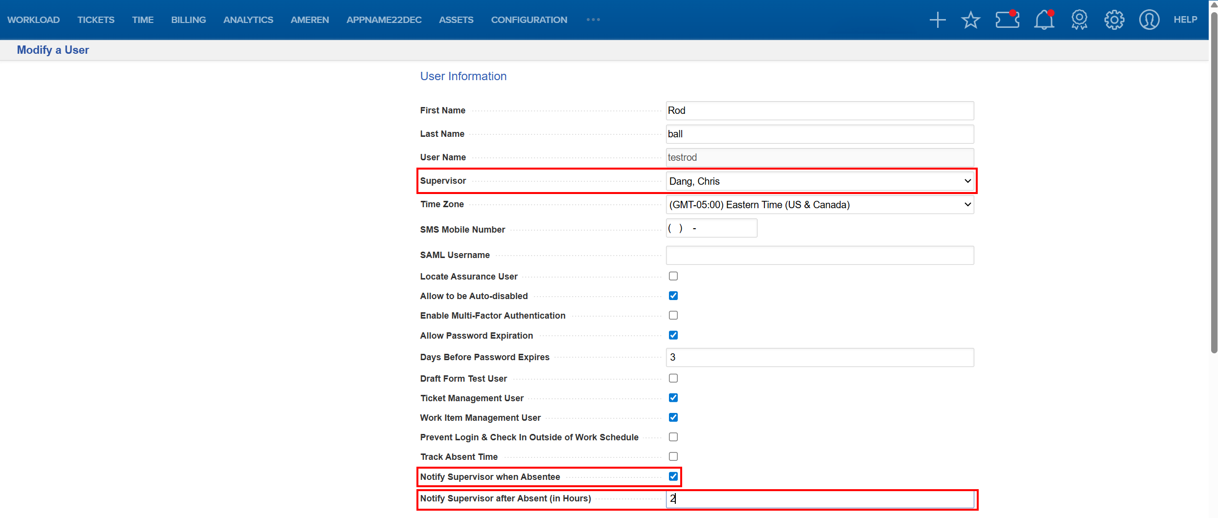 - Assign a Supervisor. This enables the Notify when Absent and Notify Supervisor after Absent (in Hours) options.
