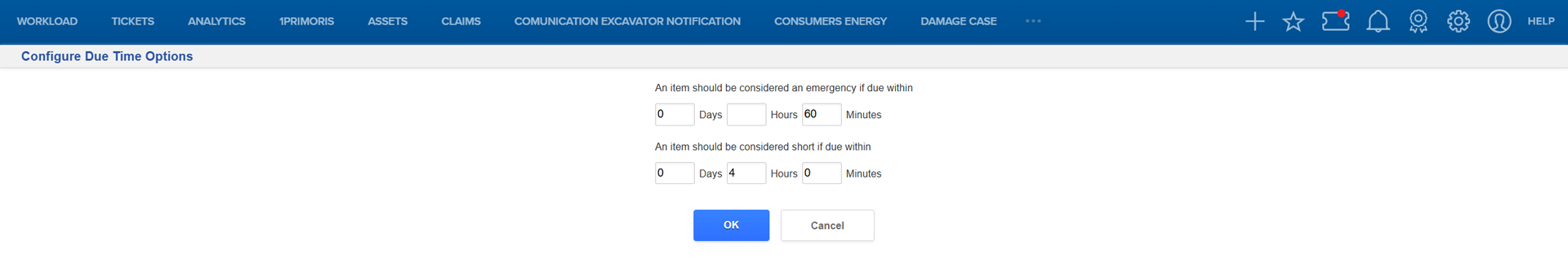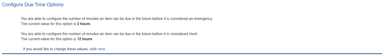| Configure Due Time Options | Set how soon a ticket is considered an emergency or short notice. |