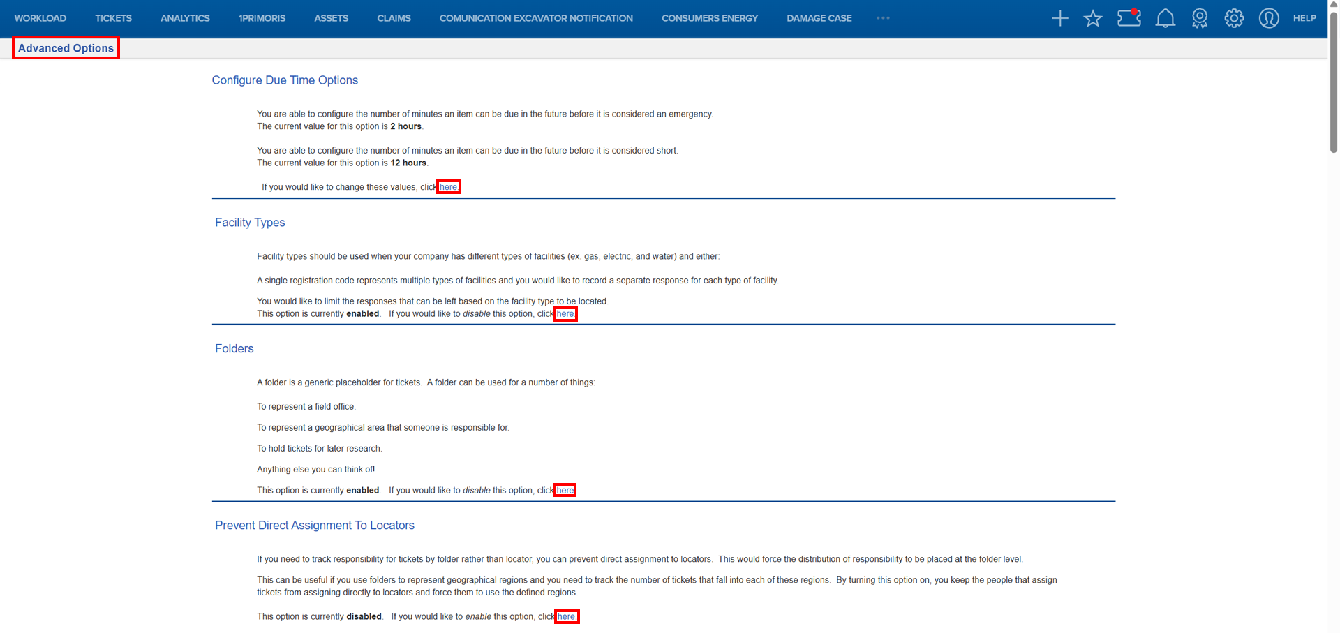 Once you've navigated to the Advanced Options list under the Options menu, you can follow the steps below to enable and configure specific options by clicking the "here" link of each option: