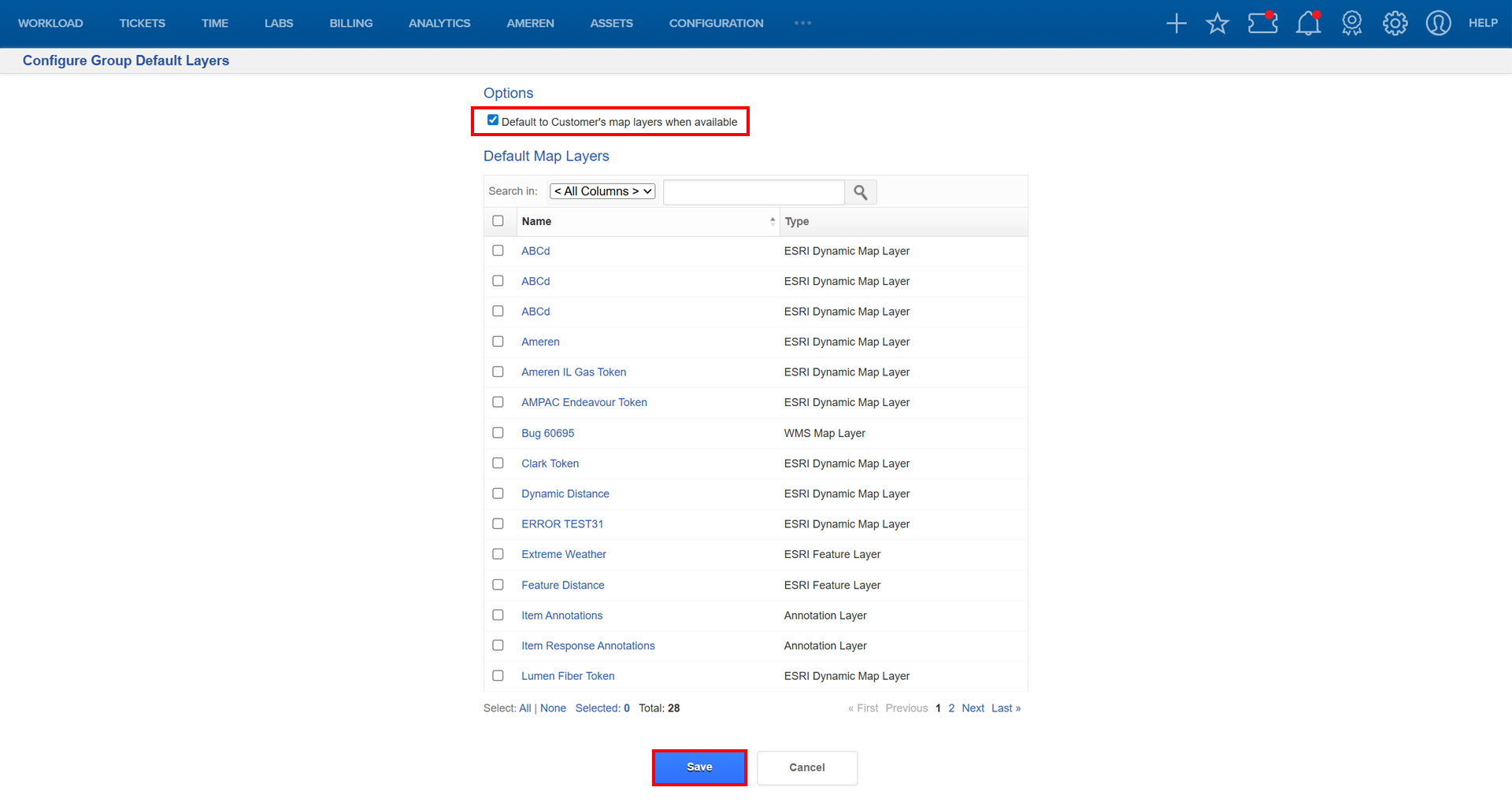 On the Configure Group Default Layers screen, under Options, enable the checkbox Default to Customer’s map layers when available and click Save.