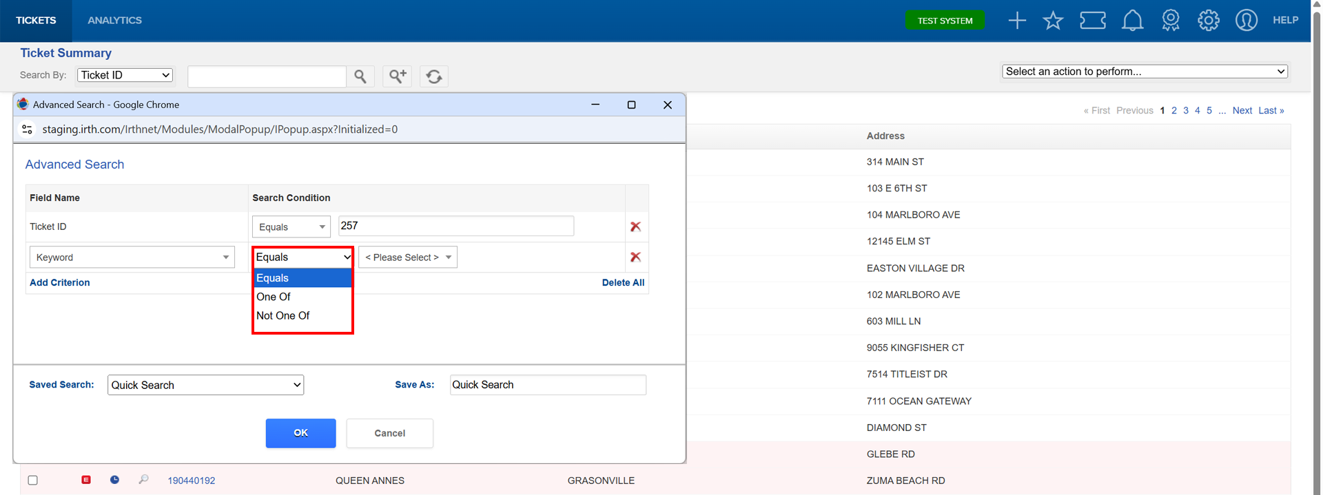 - In the Search Condition column (second dropdown), select the desired filter value and click OK to apply the filter.