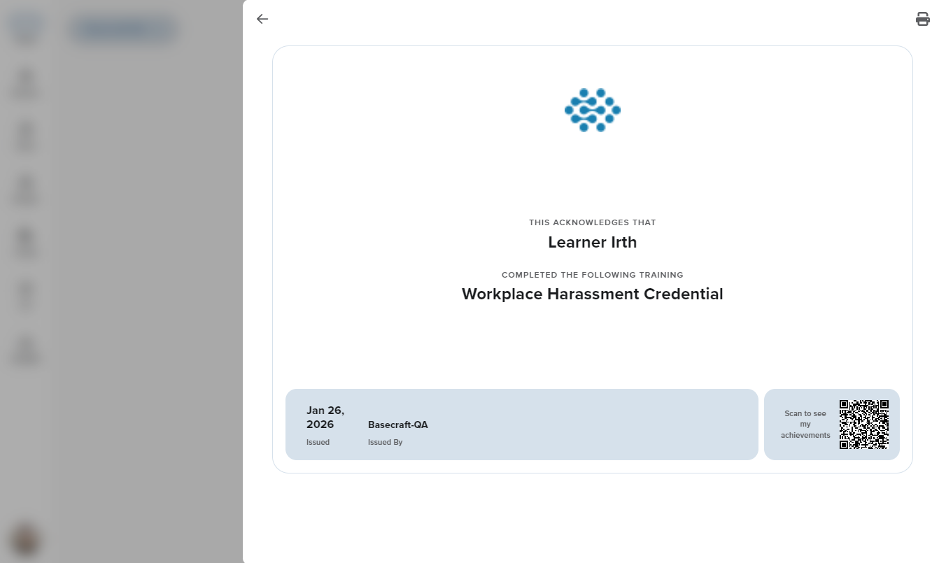 The Certificate of Completion feature provides learners with an official, system‑generated certificate once they finish any Credential training item. This gives students a clear, tangible acknowledgment of their progress and achievements. It also helps organizations validate training completion for compliance, reporting, and professional development needs. The feature is designed for all users enrolled in Credential training programs and adds value by making completion records more visible, shareable, and easy to verify.